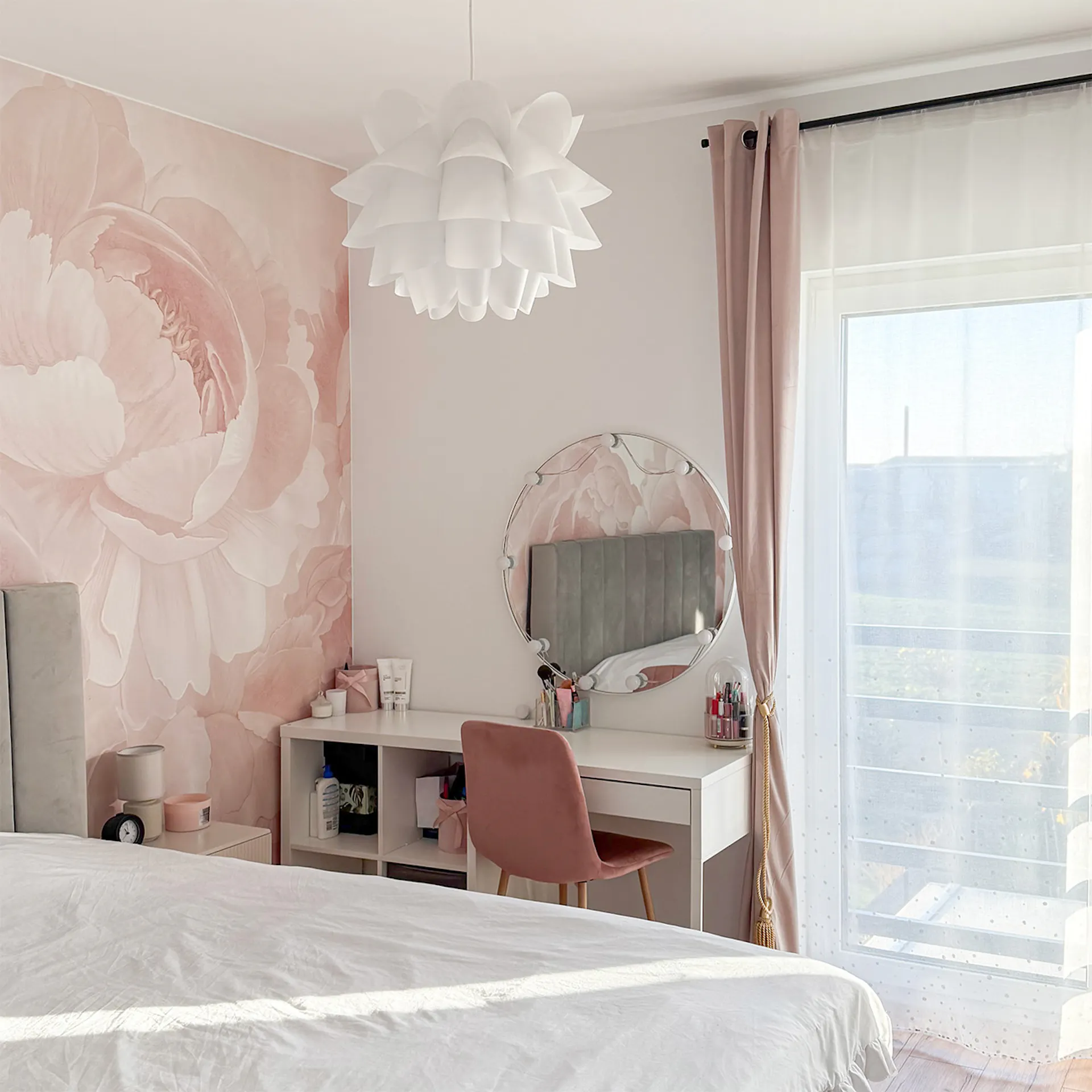 W rogu pokoju znajduje się funkcjonalna strefa z białą toaletką oraz okrągłym lustrem oświetlonym w stylu hollywood. Przemyślany i spójny projekt podkreślają detale takie jak: dekoracyjne lustro w różowej, plisowanej ramie, warstwowa biała lampa wisząca, oraz miękkie, pluszowe dywaniki ocieplające drewnianą podłogę.