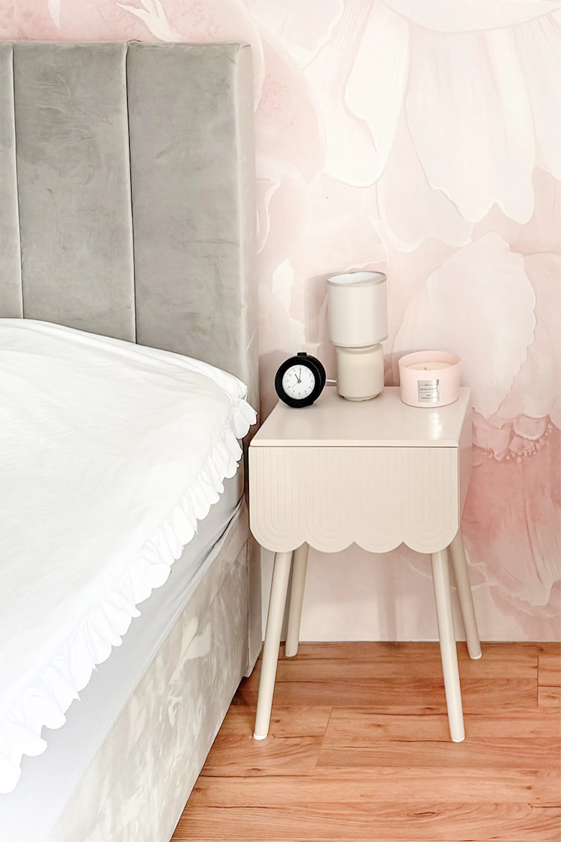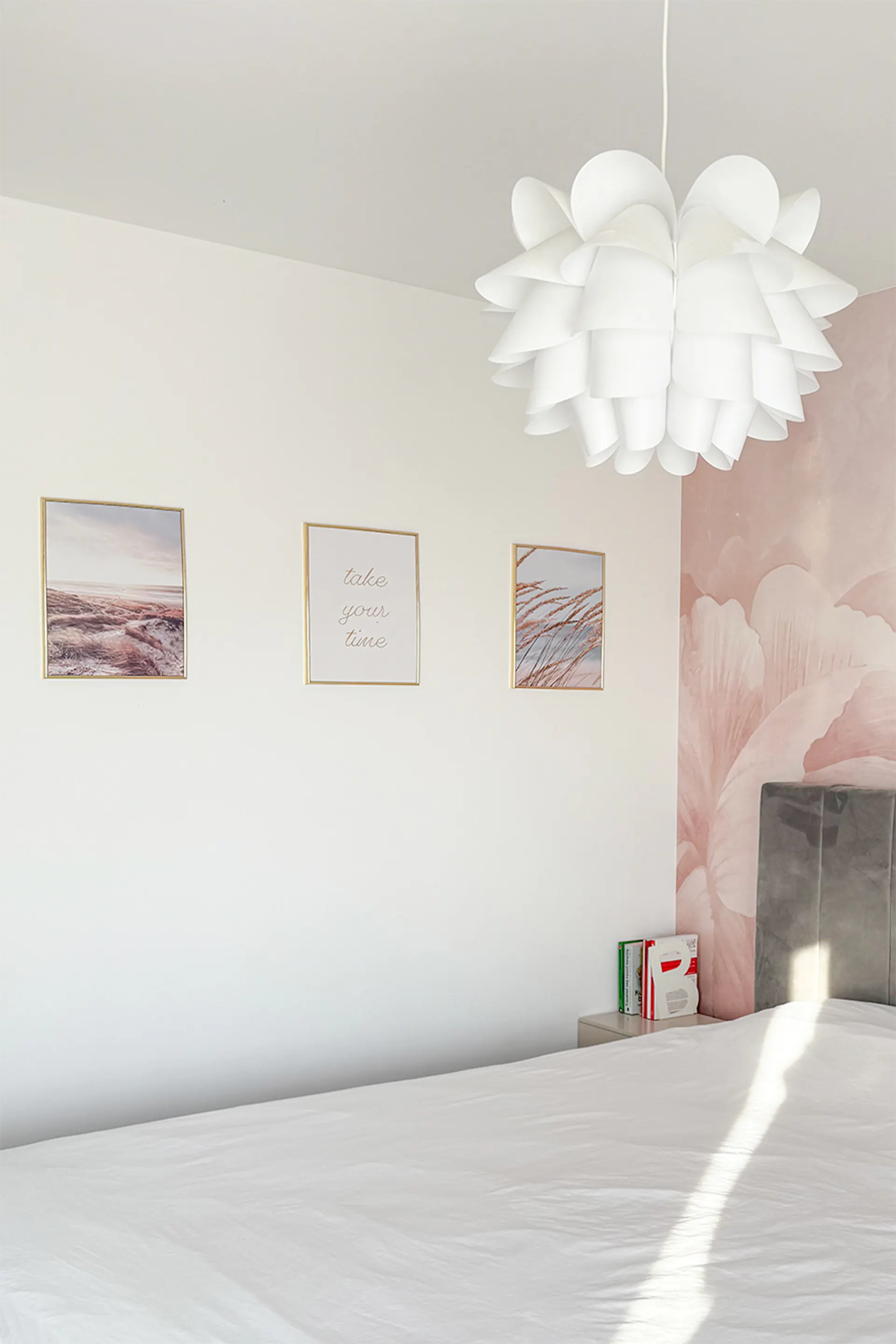 Wnętrze bazuje na jasnej, kojącej palecie. Dominują w niej pudrowy róż i delikatne szarości, przełamane czystą bielą ścian oraz ciepłym odcieniem drewnianej podłogi. Pudrowy róż, pojawiający się na welurowych tekstyliach – zasłonach, narzucie, pufie oraz miękkich, dekoracyjnych poduszkach – wprowadza do pomieszczenia romantyczną i relaksującą atmosferę.