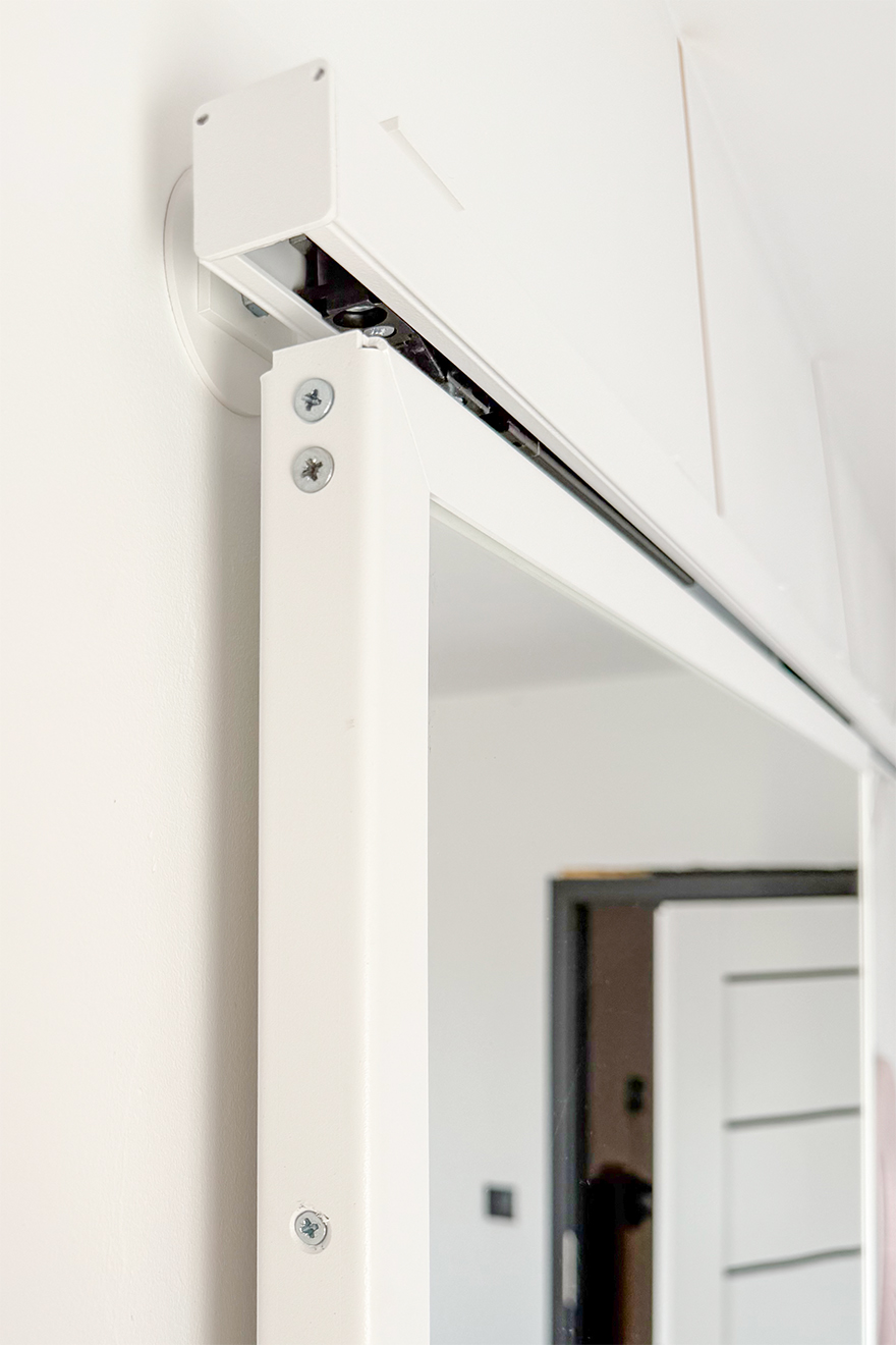 Najważniejszym elementem funkcjonalnym, który jest jednocześnie silnym akcentem wizualnym, są drzwi przesuwne do garderoby z lustrem. Lustro na całej wysokości i szerokości drzwi optycznie powiększa przestrzeń i odbija naturalne światło, rozświetlając sypialnię. Drzwi służą jednocześnie jako duże, dzienne lustro, zapewniając dyskretny dostęp do garderoby we wnęce. Biała, subtelna rama drzwi i minimalistyczny system przesuwny harmonizują z białymi ścianami, dzięki czemu całość wydaje się spójna i nowoczesna.