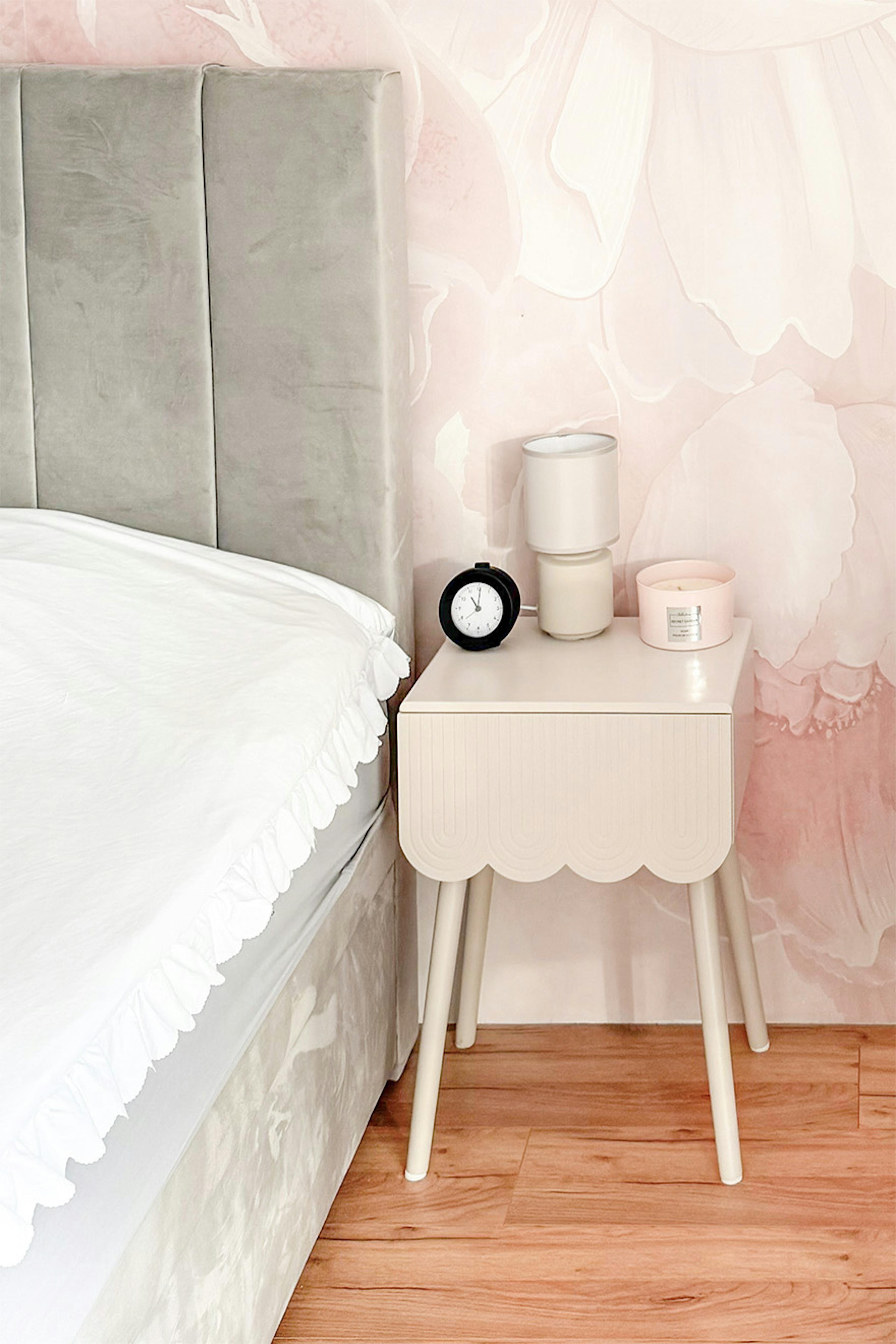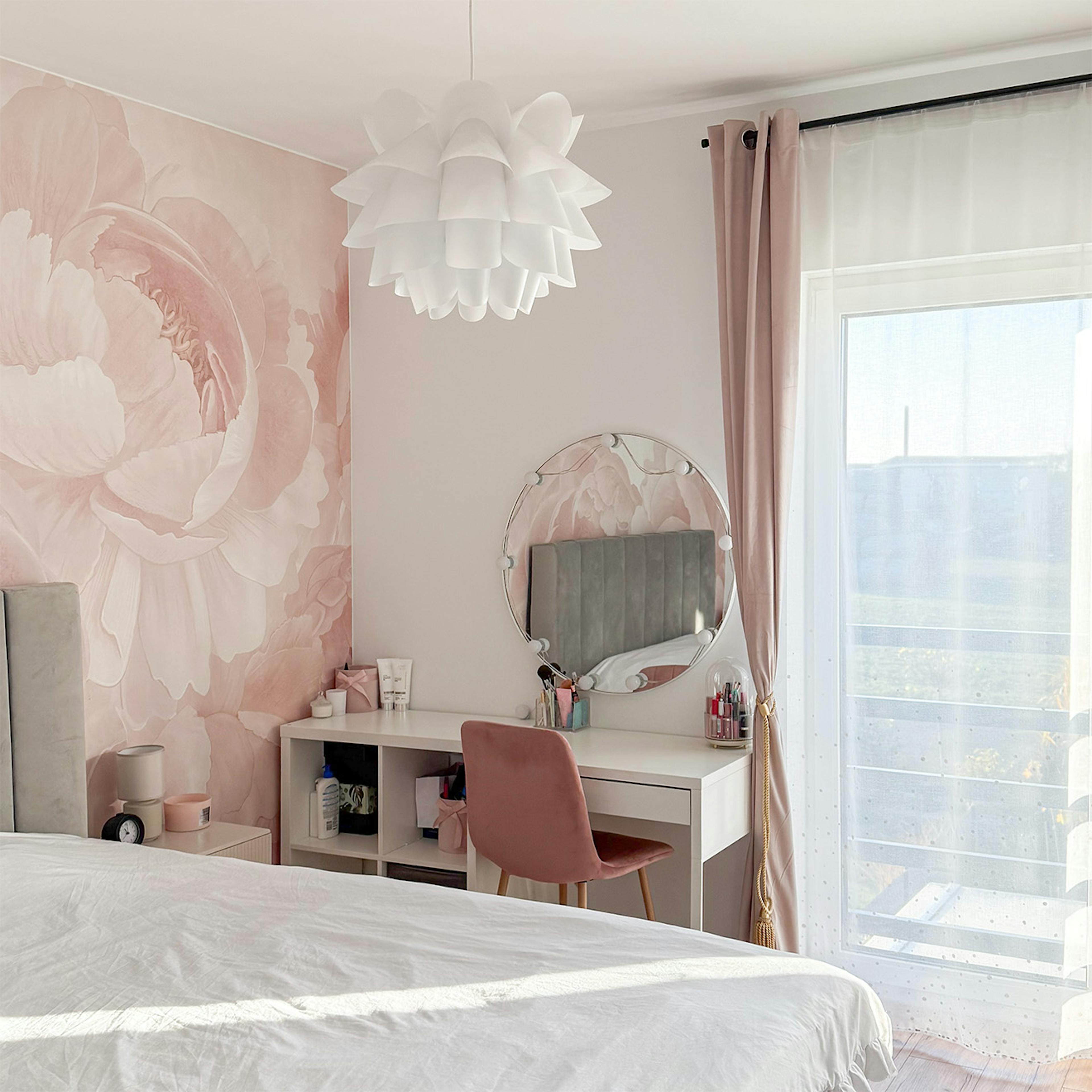 Wnętrze bazuje na jasnej, kojącej palecie. Dominują w niej pudrowy róż i delikatne szarości, przełamane czystą bielą ścian oraz ciepłym odcieniem drewnianej podłogi. Pudrowy róż, pojawiający się na welurowych tekstyliach – zasłonach, narzucie, pufie oraz miękkich, dekoracyjnych poduszkach – wprowadza do pomieszczenia romantyczną i relaksującą atmosferę.