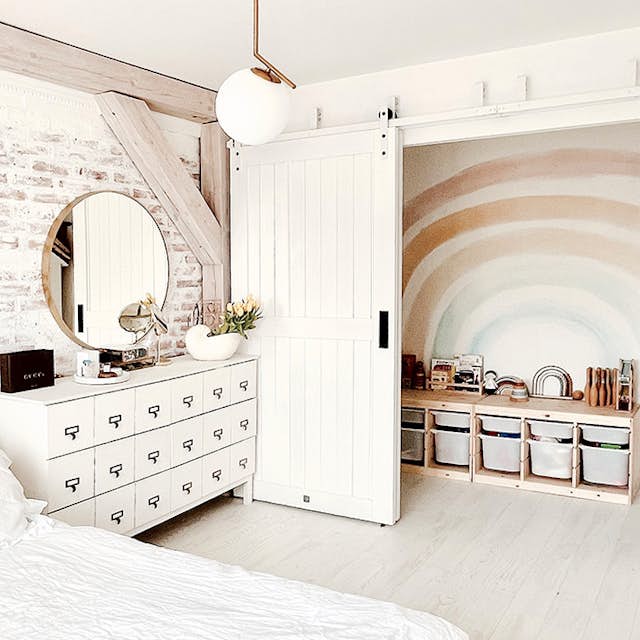 Choć rattan najczęściej widujemy w połączeniu z czarnym systemem przesuwnym, to w tym wnętrzu biel wysunęła ten wyjątkowy materiał na pierwszy plan. Rattanowe drzwi do garderoby na białym systemie przesuwnym dodały wnętrzu naturalnej lekkości.