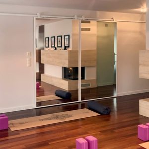 Małe mieszkanie – aranżacja z dużym lustrem w białej ramie