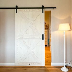 Sypialnia z łazienką za białymi drzwiami przesuwnymi