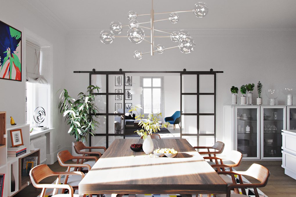 Na jednej ścianie można również zamontować dwie pary drzwi w dwóch osobnych wnękach na jednej prowadnicy. Drzwi poruszają się niezależnie od siebie, a za nimi znajdują się dwa oddzielone do siebie pomieszczenie. Jednak prowadnica, na której są zamontowane, połączone jest specjalnym łącznikiem. Takie rozwiązanie daje nam zarówno przejrzystość kompozycji, a także dowolność w przesuwaniu drzwi na całej ścianie.