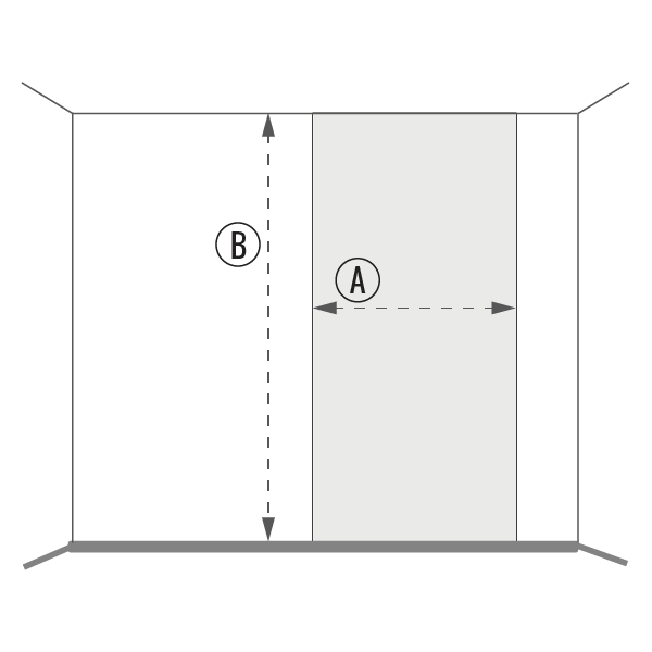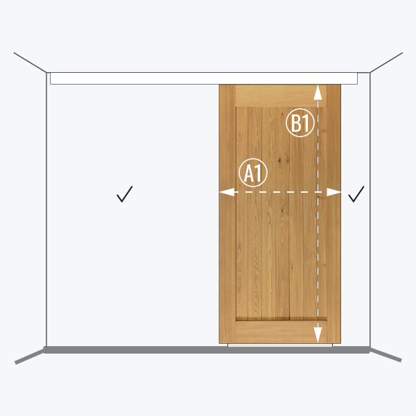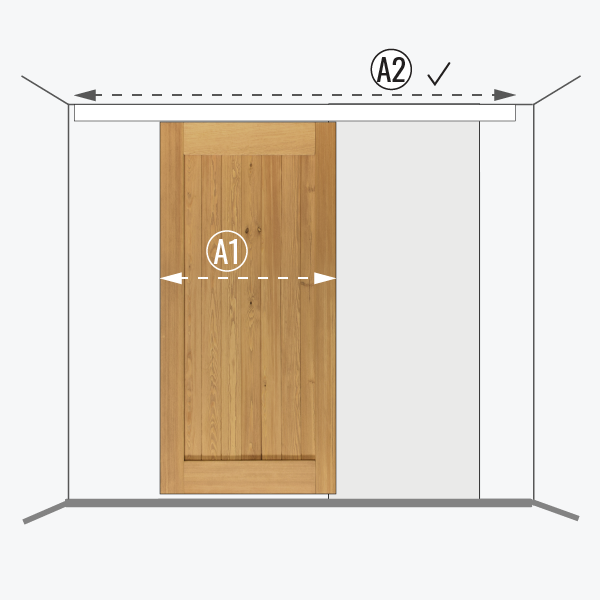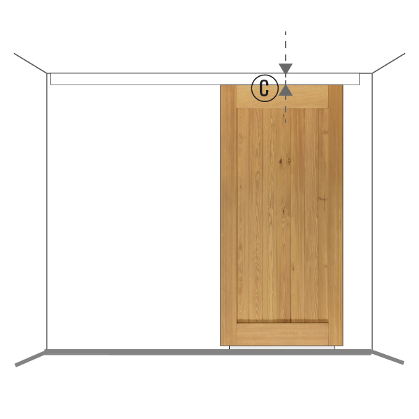 W przypadku drzwi z montażem sufitowym, skrzydło drzwi jest nieco niższe od wysokości otworu drzwiowego, ze względu na mocowanie prowadnicy do sufitu. Zwróć uwagę na ilość dostępnego miejsca pod sufitem, które jest potrzebne do prawidłowego montażu.