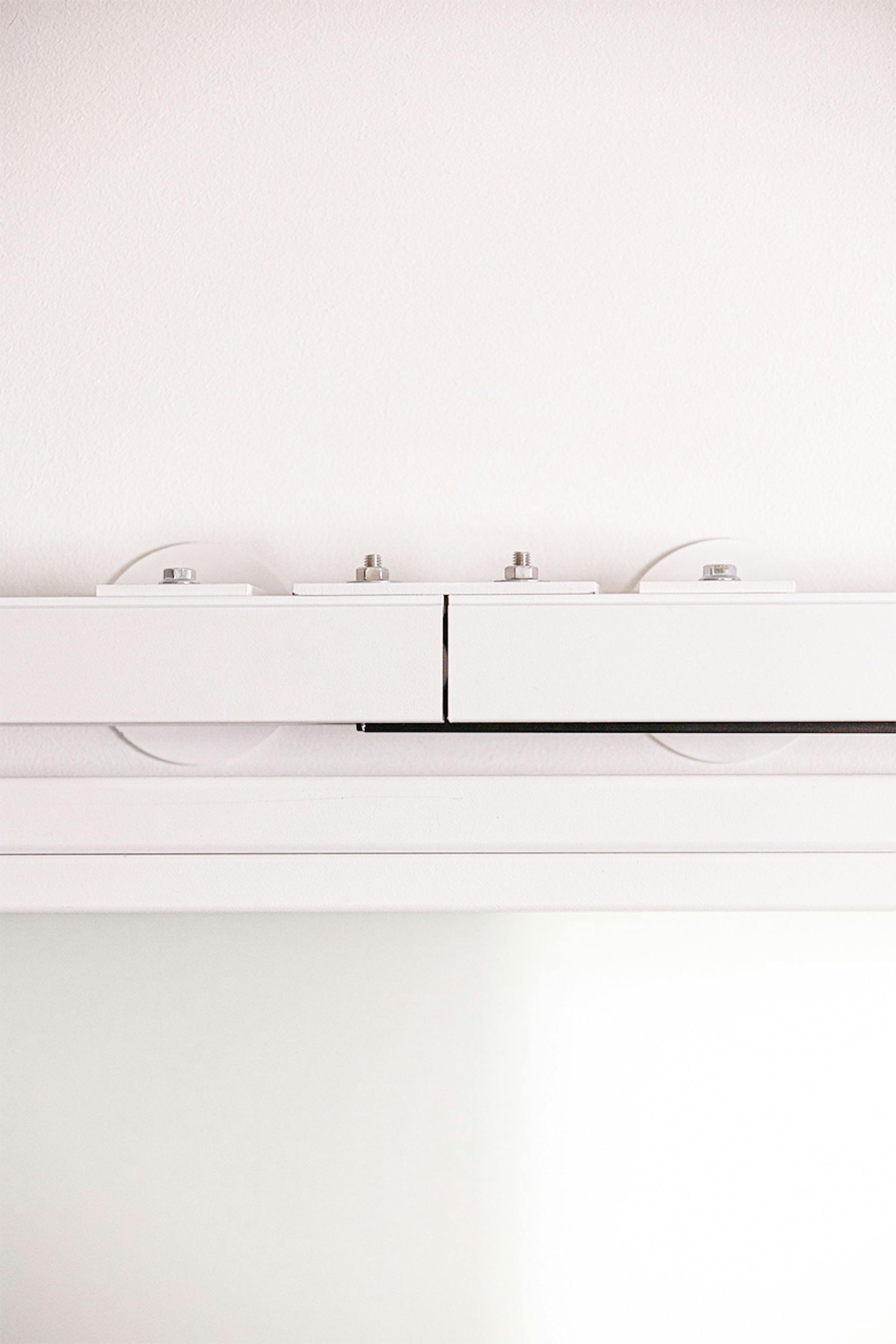 Jednym z najbardziej praktycznych i estetycznych rozwiązań są drzwi przesuwne ze szkłem, które subtelnie oddzielają strefę sypialnianą od części dziennej. To rozwiązanie zapewnia intymność sypialni, nie tracąc przy tym poczucia otwartości i swobody. Dodatkowo drzwi przesuwne pozwalają na znaczną oszczędność miejsca w tym małym mieszkaniu. Mlecznobiałe, półprzejrzyste szklane panele przepuszczają naturalne światło wpadające przez duże okna balkonowe, rozświetlając wnętrze. Minimalistyczny design drzwi z białymi stalowymi ramkami idealnie wpisuje się w lekkość i nowoczesność całego wystroju.