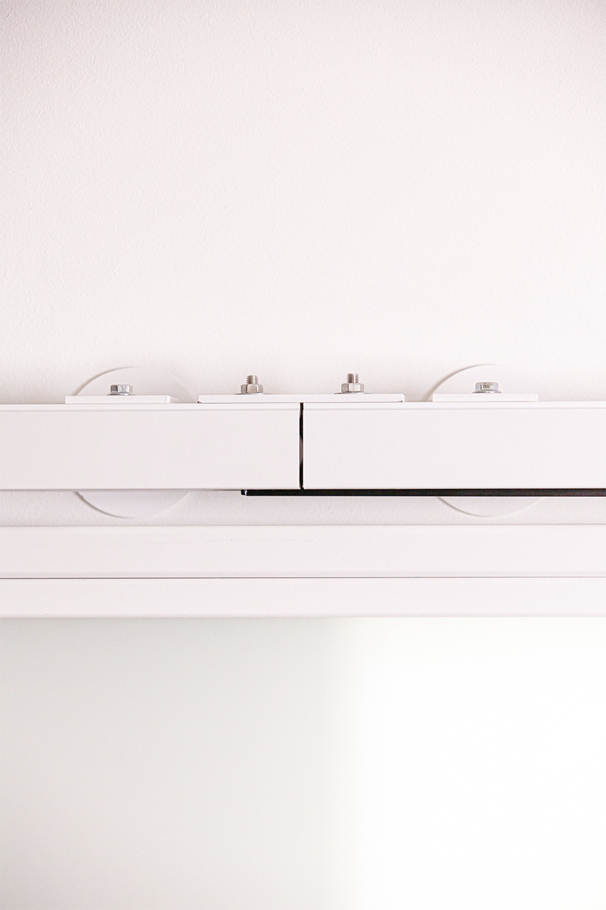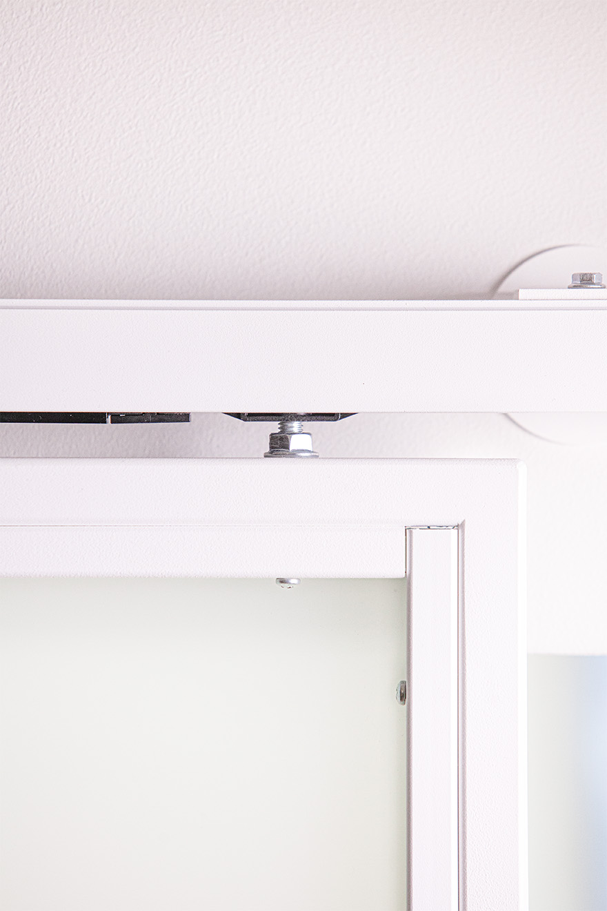 Jednym z najbardziej praktycznych i estetycznych rozwiązań są drzwi przesuwne ze szkłem, które subtelnie oddzielają strefę sypialnianą od części dziennej. To rozwiązanie zapewnia intymność sypialni, nie tracąc przy tym poczucia otwartości i swobody. Dodatkowo drzwi przesuwne pozwalają na znaczną oszczędność miejsca w tym małym mieszkaniu. Mlecznobiałe, półprzejrzyste szklane panele przepuszczają naturalne światło wpadające przez duże okna balkonowe, rozświetlając wnętrze. Minimalistyczny design drzwi z białymi stalowymi ramkami idealnie wpisuje się w lekkość i nowoczesność całego wystroju.