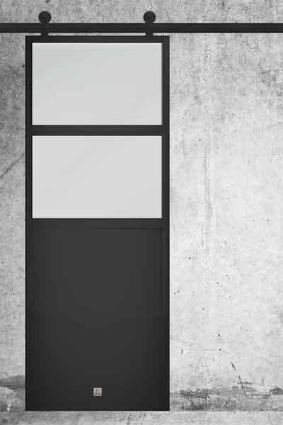 Pokój studenta, w którym wystrój jest minimalistyczny, ograniczony do niewielkiej gamy podstawowych kolorów, jak to u dorastającego mężczyzny. Ma loftową nutę, choć również z akcentami vintage, jak stare gięte krzesło upolowane na starociach, czy skrzynie wojskowe z demobilu, zdobyte na wojskowej aukcji i podane własnoręcznej renowacji. Gdy pokój nastolatka zdecydowanie wymagał dostosowania do wieku właściciela, głównym założeniem było, że ma być wygodnie, jasno i bezproblemowo. Jako ozdoby wykorzystano głównie elementy związane z pasją mieszkającego tu studenta czyli muzyką. Pokój studenta nie jest duży, więc bardzo ważne było, żeby można było zmieniać jego układ i aranżację w zależności od potrzeb. Dominują więc lekkie, wielofunkcyjne i łatwe do przestawienia elementy o młodzieżowym charakterze. Przestrzeń można swobodnie zmieniać, dostosowując ją do potrzeb chwili. Centralny punkt dowodzenia stanowi sporej wielkości biurko, pozwalające na wygodną naukę. Są retro skrzynie, wygodnie zamontowane na kółkach, które mogą służyć za stolik kawowy, stolik do gier, a czasem również za dodatkowe miejsce do siedzenia. Drzwi przesuwne doskonale uzupełniają, a wręcz nadają charakter takiej aranżacji pokoju studenta. Zamontowano tu model Verriere z linii Industrial, z wypełnieniem z mlecznego szkła. Co ważne, drzwi idealnie, co do centymetra, wpisały się we wnękę pomiędzy ścianą a przewodem kominowym, wypełniając całe zagłębienie. Dzięki wypełnieniu z mlecznego szkła nie tylko zapewniają odpowiednią prywatność, ale również doświetlają wnętrze w obydwie strony, co korzystnie wpływa na dostęp światła dziennego zarówno w prezentowanym wnętrzu oraz w przedpokoju znajdującym się tuż za drzwiami. Mimo że pokój ten zdecydowanie odbiega w wystroju od reszty domu, który ma znacznie bardziej kobiecy charakter, to drzwi Verriere łączące obydwie sfery stanowią przejście komponujące się dobrze z każdej strony.