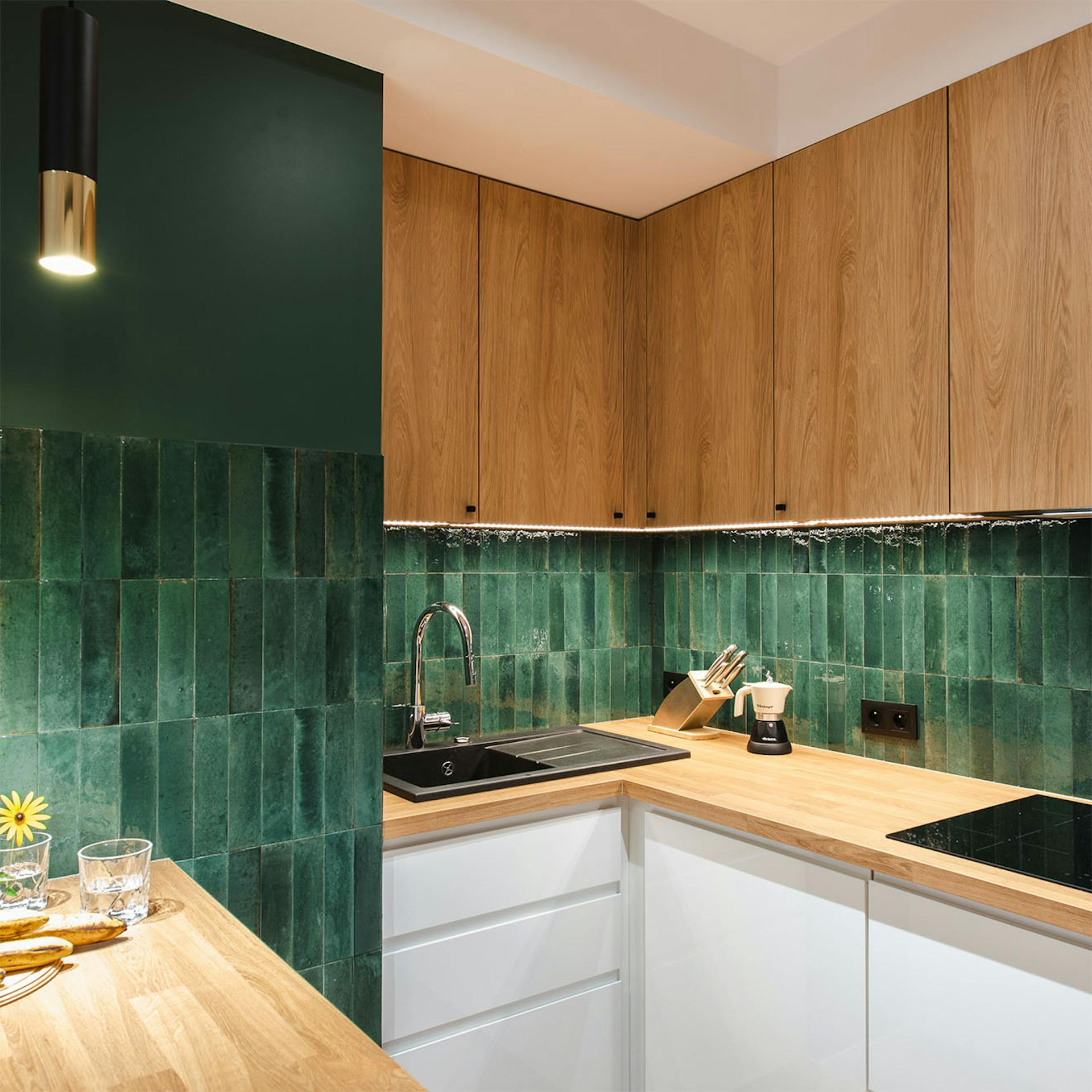 Centralnym miejscem tego mieszkania dla czteroosobowej rodziny jest salon połączony z aneksem kuchennym. Znajduje się tam jasnoszara sofa, niewielki stół jadalniany oraz grafitowa komoda. Jedną ze ścian salonu wykończono czerwoną cegłą, która dodaje koloru i przytulności. Całość dopełnia drewniana podłoga w jodełkę. Nie zabrakło również dekoracji w postaci plakatów w delikatnych czarnych ramkach. Ciemnozielone płytki nad blatem kuchennym nawiązują do zielonych akcentów w całym mieszkaniu.