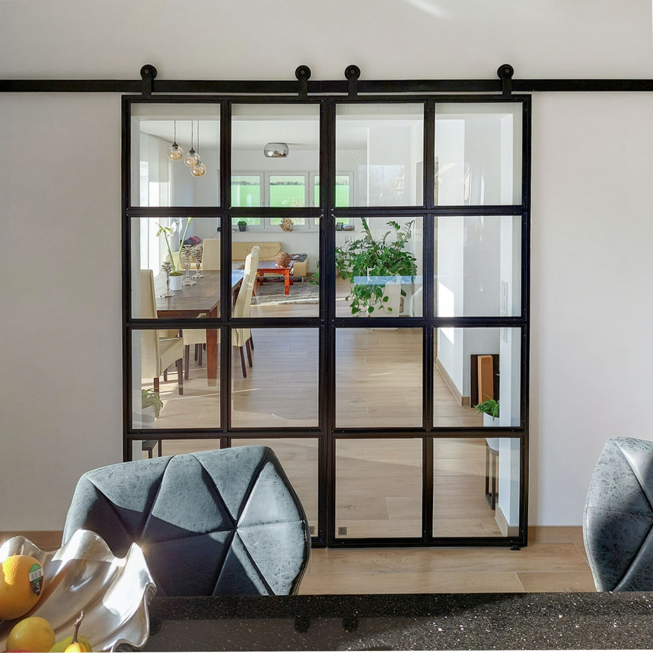Wyjątkowym akcentem tego wnętrza są czarne, metalowo-szklane drzwi przesuwne, które łączą w sobie funkcjonalność i estetykę. Pełnią rolę przejść między strefami, pozwalając na dowolne kształtowanie przestrzeni według potrzeb i nastroju. Przezroczyste szkło przepuszcza naturalne światło, jednocześnie utrzymując wizualną ciągłość całego wnętrza. Takie podwójne drzwi stanowią nie tylko praktyczne rozwiązanie, ale przede wszystkim piękny industrialny akcent.