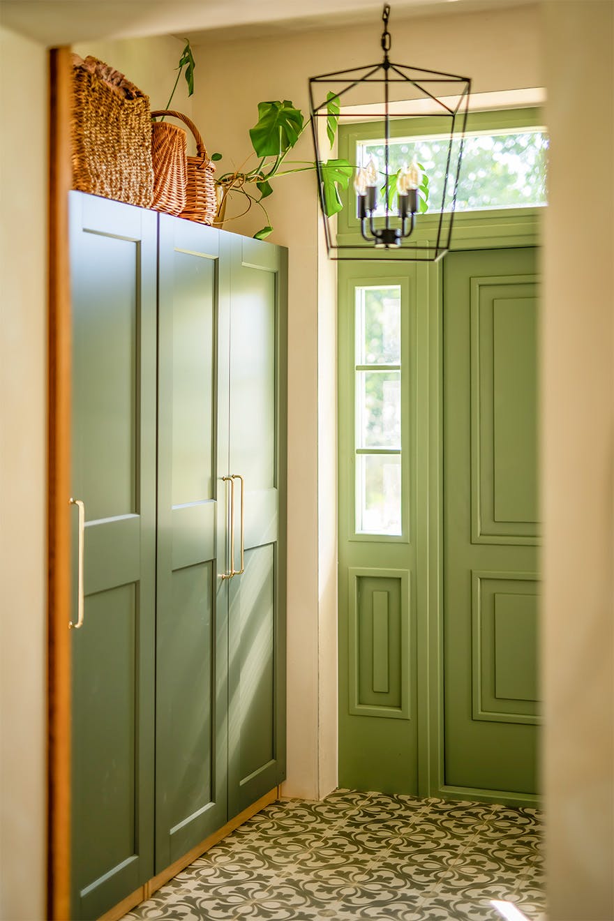 We wnętrzu dominuje harmonijny trójkąt kolorystyczny, gdzie główną rolę odgrywają odcienie zieleni. Subtelne zielone barwy zastosowane na zabudowie szaf, na drzwiach wejściowych oraz na malowanych frontach komody wprowadzają element spokoju, kontaktu z naturą oraz odczucie lekkości. Ściany utrzymane są w ciepłym białym lub kremowym odcieniu, który stanowi neutralne tło dla żywej zieleni i naturalnego drewna.