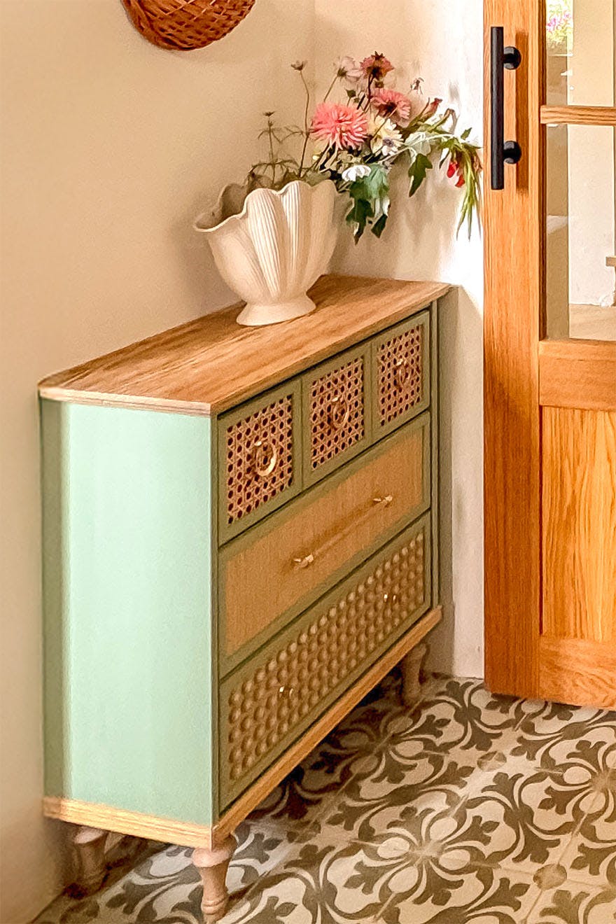 W przedpokoju znajdziemy także oryginalną komodę łączącą drewniany blat z malowanymi frontami oraz zdobionymi plecionką, co nadaje jej unikalny, rzemieślniczy charakter. Podłogę zdobią dekoracyjne płytki o geometryczno-roślinnym wzorze w odcieniach szarości i zieleni. Wprowadzają one dynamiczny klimat, który doskonale kontrastuje z prostotą ścian. Geometryczna lampa w kształcie latarenki wykonana z metalu koresponduje z czarnym systemem drzwi przesuwnych.