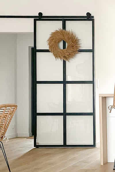 W tym domu szklane drzwi przesuwne mają za zadanie oddzielać część dzienną od sypialnianej. Właściciele zdecydowali się na model Verriere, ze szkłem transparentnym. Zostały one zamontowane w części dziennej, a za nimi znajduje się korytarz, który prowadzi do sypialni domowników. Model Verriere świetnie zgrywa się z nowoczesnym wystrojem tego wnętrza. Czarno biała, otwarta kuchnia jest minimalistyczna. Obok niej znajduje się duży drewniany stół z krzesłami i długim minimalistycznym żyrandolem, który oświetla cały blat. Po przeciwnej stronie drzwi znajduje się salon z kominkiem. We wnętrzu można zobaczyć wiele drobnych dodatków i ozdób. Wnętrze tego domu, choć minimalistyczne i nowoczesne, dzięki dodatkom jest bardzo przytulne.
