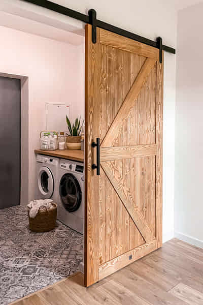 Punktem, który od razu przyciąga wzrok po wejściu, są drzwi przesuwne w stylu barn door. Wykonane z naturalnego dębowego drewna z delikatnym usłojeniem, stanowią wyrazisty, a zarazem ciepły akcent w tym minimalistycznym wnętrzu. Czarne okucia i duży, prosty uchwyt podkreślają nowoczesny charakter drzwi. Zamiast zajmować miejsce, drzwi przesuwają się wzdłuż ściany, odsłaniając lub zamykając strefę garderoby – rozwiązanie niezwykle praktyczne i wygodne. Wierzchnie ubrania oraz obuwie pozostają ukryte przed wzrokiem gości, dzięki czemu przedsionek zawsze prezentuje się schludnie i uporządkowanie.