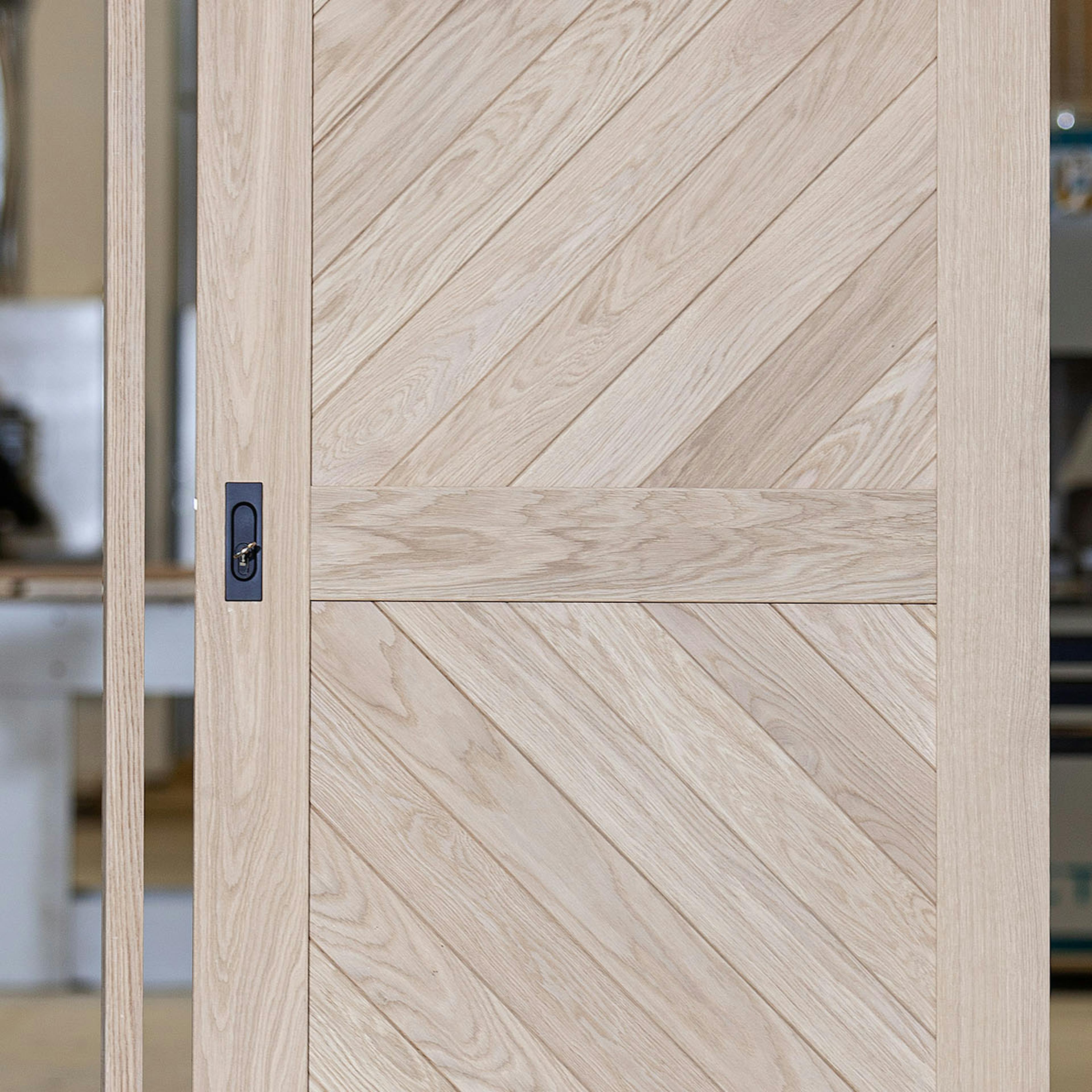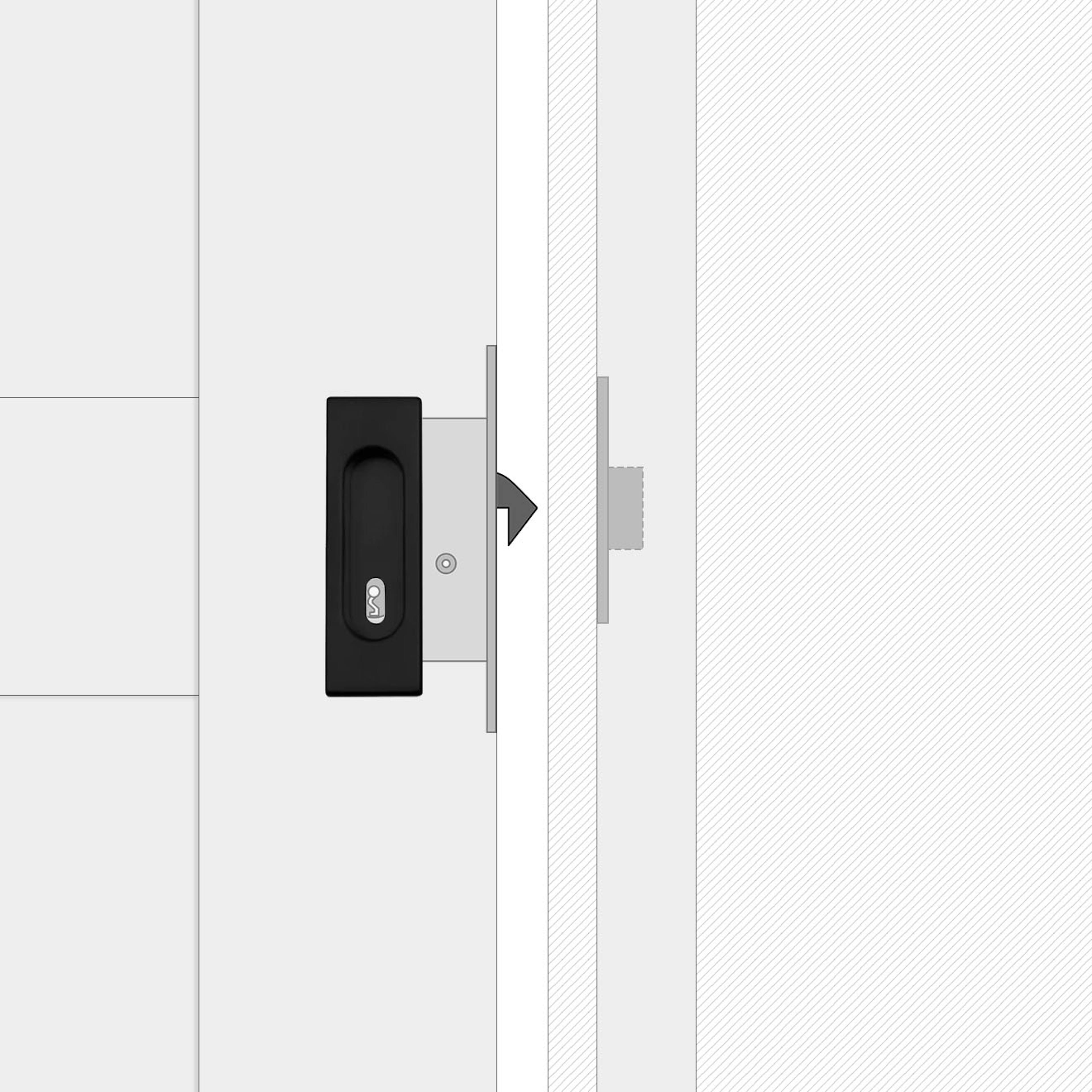 Zamki do jednoskrzydłowych drzwi przesuwnych składają się ze wpuszczanego uchwytu ze zintegrowanym zamkiem oraz dedykowanej drewnianej belki. Wyróżnia je minimalistyczny design i prosta forma. Owalne wgłębienie idealnie wpasowuje się w kwadratowy kształt uchwytu, zapewniając estetykę i wygodę użytkowania.