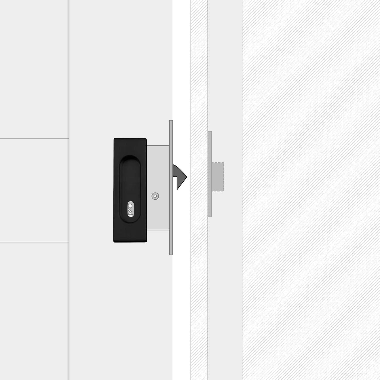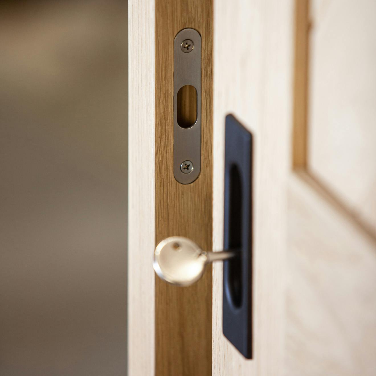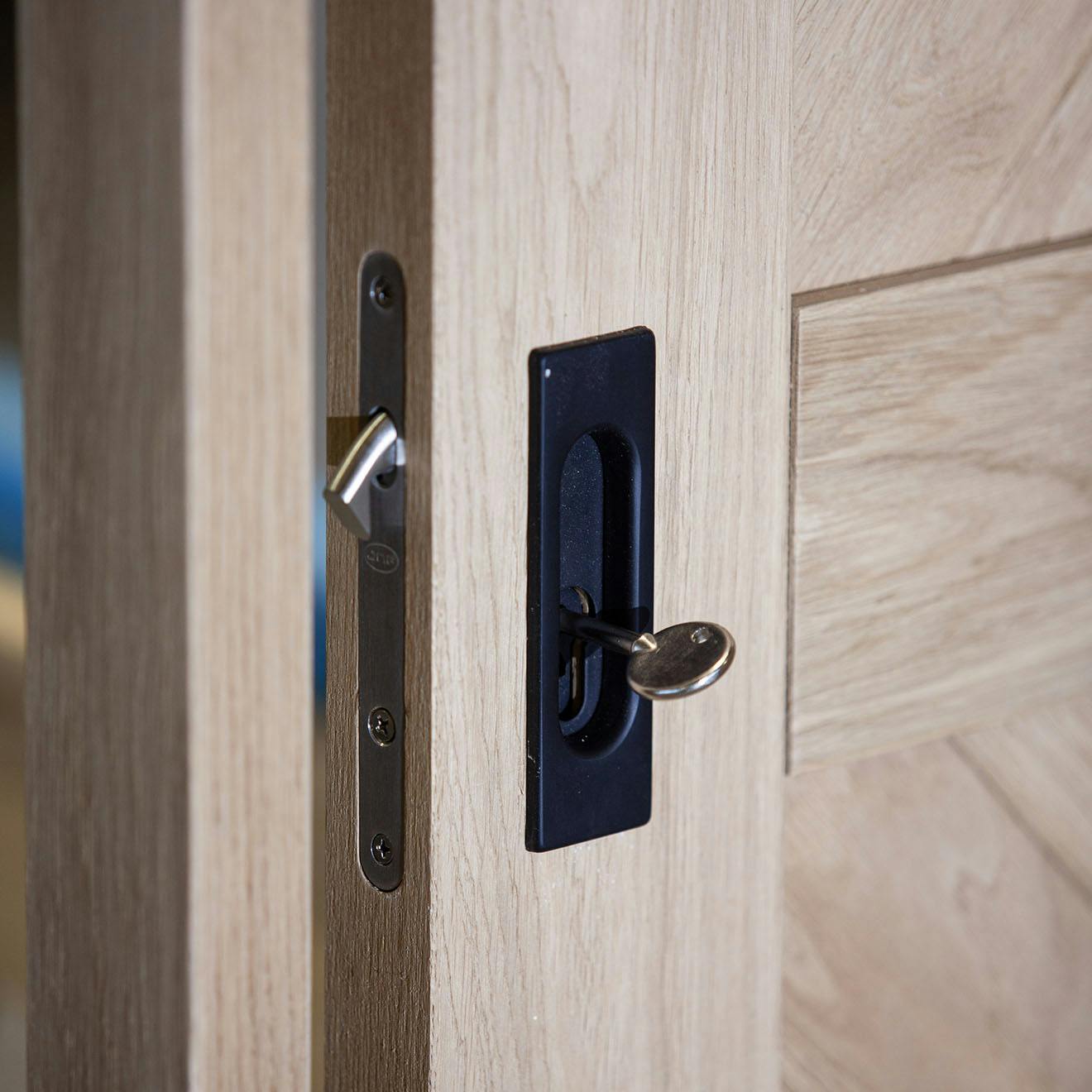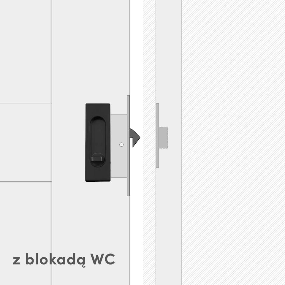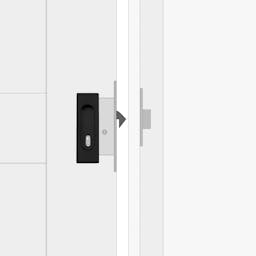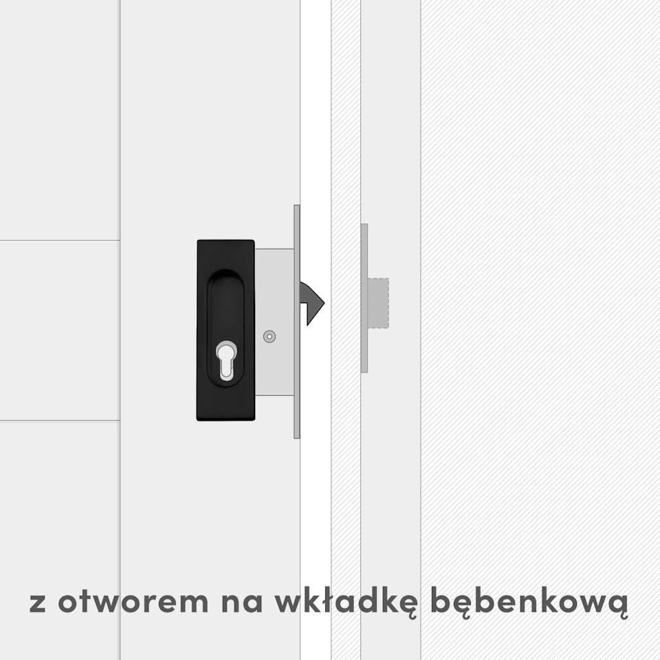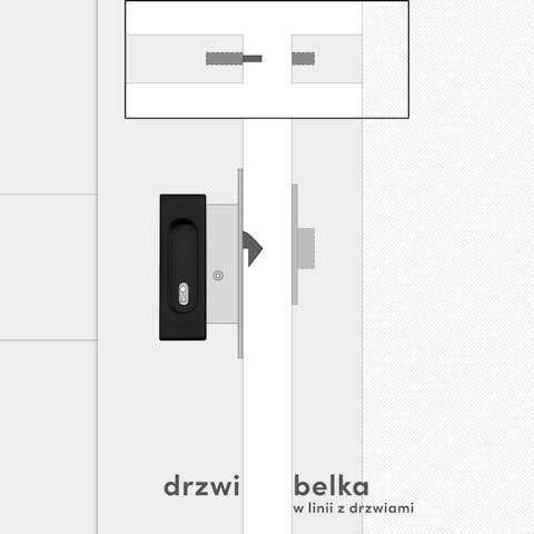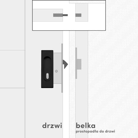 Zamki do jednoskrzydłowych drzwi przesuwnych składają się ze wpuszczanego uchwytu ze zintegrowanym zamkiem oraz dedykowanej drewnianej belki. Wyróżnia je minimalistyczny design i prosta forma. Owalne wgłębienie idealnie wpasowuje się w kwadratowy kształt uchwytu, zapewniając estetykę i wygodę użytkowania.