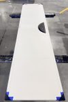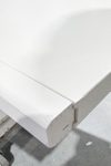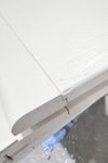 Drzwi przesuwne dwuskrzydłowe, model MINIMALIST w kolorze białym (RAL9010) o wymiarach 2 x (55 x 230 cm). Na obu skrzydłach, po obu stronach drzwi zamontowane są ciemne klamki w kształcie półksiężyca. Drzwi posiadają nawiercone otwory pod wieszaki Hidden.