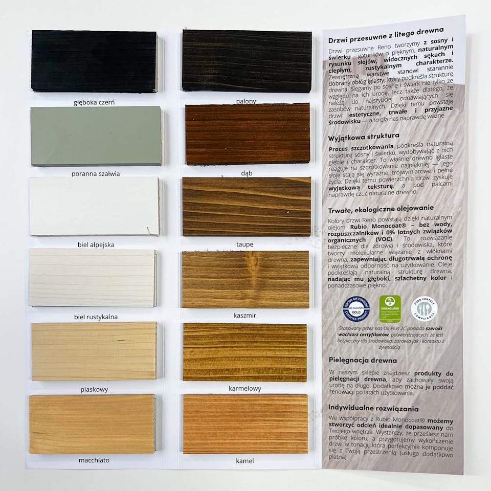 Wzornik kolorów ma za zadanie pomóc w dokonaniu trafnego wyboru wykończenia dla naszych drzwi wykonanych z sosny. Umożliwia wygodną weryfikację odcienia i nasycenia barwy w domowym świetle i otoczeniu.