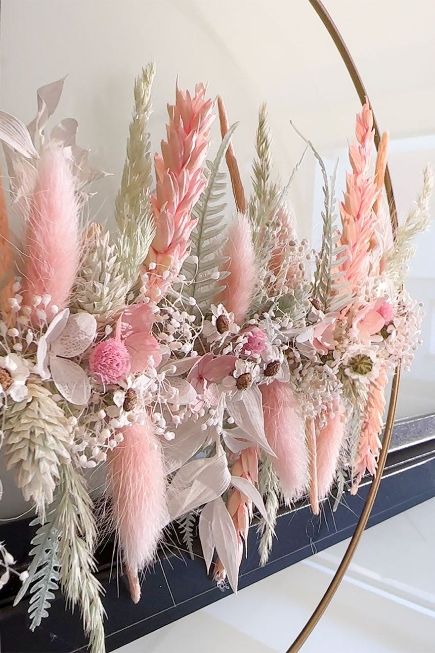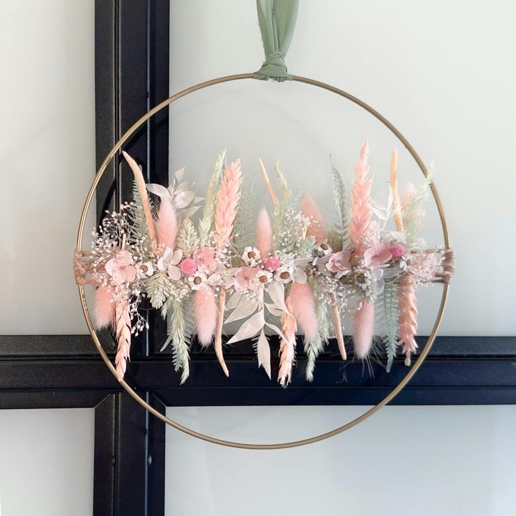 Wiosenna Łąka to duży wianek o średnicy 45 centymetrów, który pokochają wszyscy miłośnicy stylu boho oraz ciepłych, przytulnych, kolorowych wnętrz. Pampasy, ozdobne trawy, lagurus, mozga kanaryjska i drobne kwiaty tworzą magiczną kompozycję pełną uroku, a słomiana obręcz dodaje rustykalnego charakteru. Tego typu wianki (nieważne, czy wypleciesz je samodzielnie, czy kupisz u nas) sprawdzą się idealnie we wnętrzach stylizowanych na wiejskie, szczególnie modern farmhouse, a także w tych inspirowanych boho czy elementami etno.